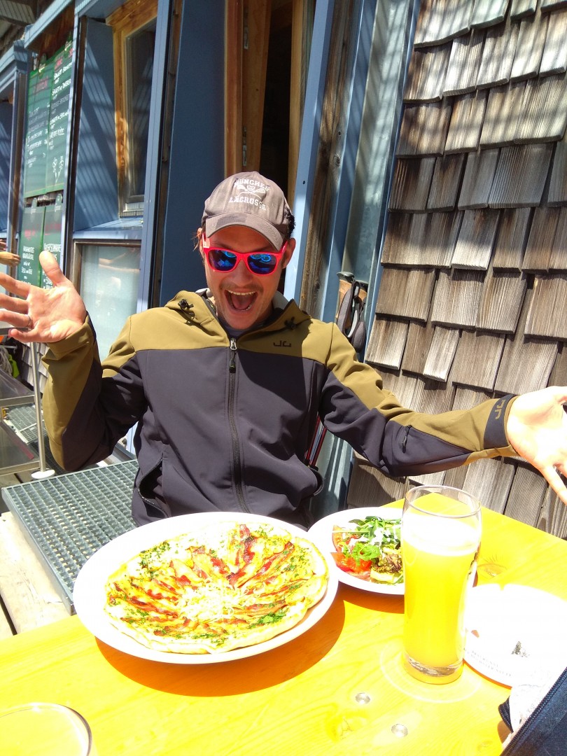 Die Verlockungen der Speisekarte waren allerdings wohl zu groß für uns und so fanden wir uns zwei Stunden später in einem rundum übersättigten Zustand auf der Sonnenterrasse der Hütte wieder. Es gibt Schlimmeres als reichlich vieles Essen, allerdings bei 900m Abstieg nicht unbedingt die erste Wahl.