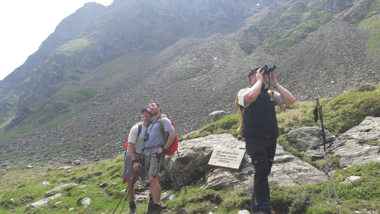 Nach dem Super Einstand gestern ging es heute richtig los mit vollem Programm. Nach einem Riesenfrühstück machten wir uns auf zum Parkplatz Seichenbrunn, dem Ausgangspunkt für viele Wanderungen im Nationalpark Hohe Tauern, wo uns Andreas unser Nationalpark-Ranger und Sandra vom Nationalpark-Team schon erwarteten. Wir waren sofort auf einer Wellenlänge und starteten durch zur Trelebitsch-Alm. Ein Überbleibsel vom Gewitter am letzten Abend zwang uns zwar kurzzeitig zu Beginn unter einen Baum, den Schauer nutzten wir aber spontan für eine Einführung in die Nationalparkphilosophie.