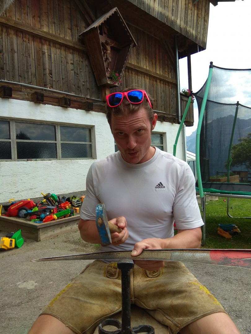 Nach dem Abstieg gings direkt weiter zum Gerlhof, wo Gastgeberin Margit, Bauer Leo und Kuh Judith schon auf uns warteten. Nach einem selbstgemachten Begrüßungs-Zirbenschnaps gings direkt los mit dem Dengeln und Schleifen der Sense um dann frisches Gras für Judith zu schneiden – immerhin wollten wir ja auch an ihre Milch – fairer Deal!