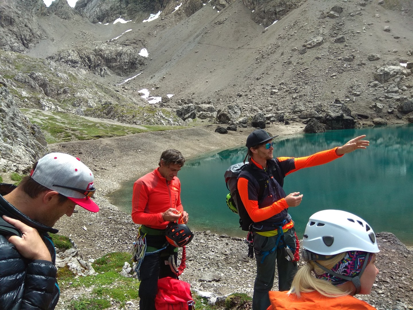 Ein kleines Wunder! Und die Chance das mitgeschleppte Klettersteigset doch noch auszuprobieren. Isi und Matthias gaben uns eine professionelle Einführung und schon stürzten wir uns in die erste Ferrata – eine Mordsgaudi! Die Freude war so groß, dass wir direkt die Chance zum Bad im nächsten Bergsee (unsere heimliche Passion) nutzten, bevor es weiterging mit Kraxel-Übungen. Wir probierten uns am Toprope-Klettern, stellten uns erstaunlich gut an – wenn man den erfahrenen Anfeuerern aka Bergführern glauben schenken möchte: „Super! Ja Wahnsinn! Die neuen Huaberbuam!“ Es bleibt der Verdacht, dass es trotz der Lobpreisungen noch ein weiter Weg bis zum El Capitan ist, den wir uns spontan als nächstes sportliches Ziel auserkoren haben…