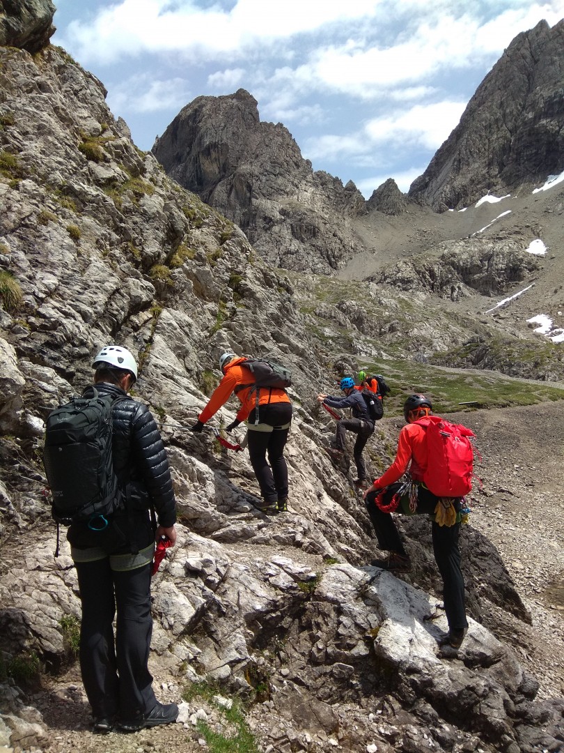 Ein kleines Wunder! Und die Chance das mitgeschleppte Klettersteigset doch noch auszuprobieren. Isi und Matthias gaben uns eine professionelle Einführung und schon stürzten wir uns in die erste Ferrata – eine Mordsgaudi! Die Freude war so groß, dass wir direkt die Chance zum Bad im nächsten Bergsee (unsere heimliche Passion) nutzten, bevor es weiterging mit Kraxel-Übungen. Wir probierten uns am Toprope-Klettern, stellten uns erstaunlich gut an – wenn man den erfahrenen Anfeuerern aka Bergführern glauben schenken möchte: „Super! Ja Wahnsinn! Die neuen Huaberbuam!“ Es bleibt der Verdacht, dass es trotz der Lobpreisungen noch ein weiter Weg bis zum El Capitan ist, den wir uns spontan als nächstes sportliches Ziel auserkoren haben…
