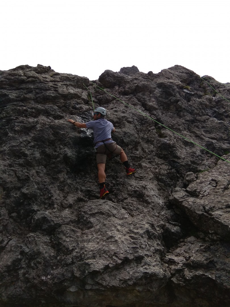 Am letzten Tag stand nochmal ein Highlight an: Aufstieg zur Karlsbader Hütte mit Klettersteig und anschließendem Klettern im Kletterparadies rund um die Hütte. Um genügend Zeit zu haben ging es schon um 7:00 erst zum Dolomitenhaus um unsere Bergführer Isidor und Matthias zu treffen. Hielt das Wetter auch anfangs noch, was die letzten Tage mit ihrem Traumwetter versprochen hatten, so sah es ziemlich schnell ziemlich düster aus. Angesichts des strömenden Regens und des immer noch anhaltenden Gewitters vom Vorabend kam der Klettersteig nicht in Frage – viel zu gefährlich! Also auf dem Normalweg nach oben um dort weiterzuschauen. Flo und ich machten das beste aus dem Wetter, zogen die Regenjacken aus und gaben ordentlich Gas beim Aufstieg. Nass bis auf die Haut konnten wir uns zum Glück bei Hüttenwirtin Edith am Holzofen wie die Grillhendl trocknen lassen, während vor der Hütte weiterhin Weltuntergangswetter angesagt war. Was also tun? Flo und ich nutzten die Gelegenheit zum Powernap um uns von den vielen Highlights der letzten Tage zu erholen. Leider war auch nach dem Aufstehen noch keine Besserung in Sicht – die brachte erst das Mittagessen, leckere Spinatnocken, die die Wolken vertrieben und tatsächlich für Sonnenschein sorgten!