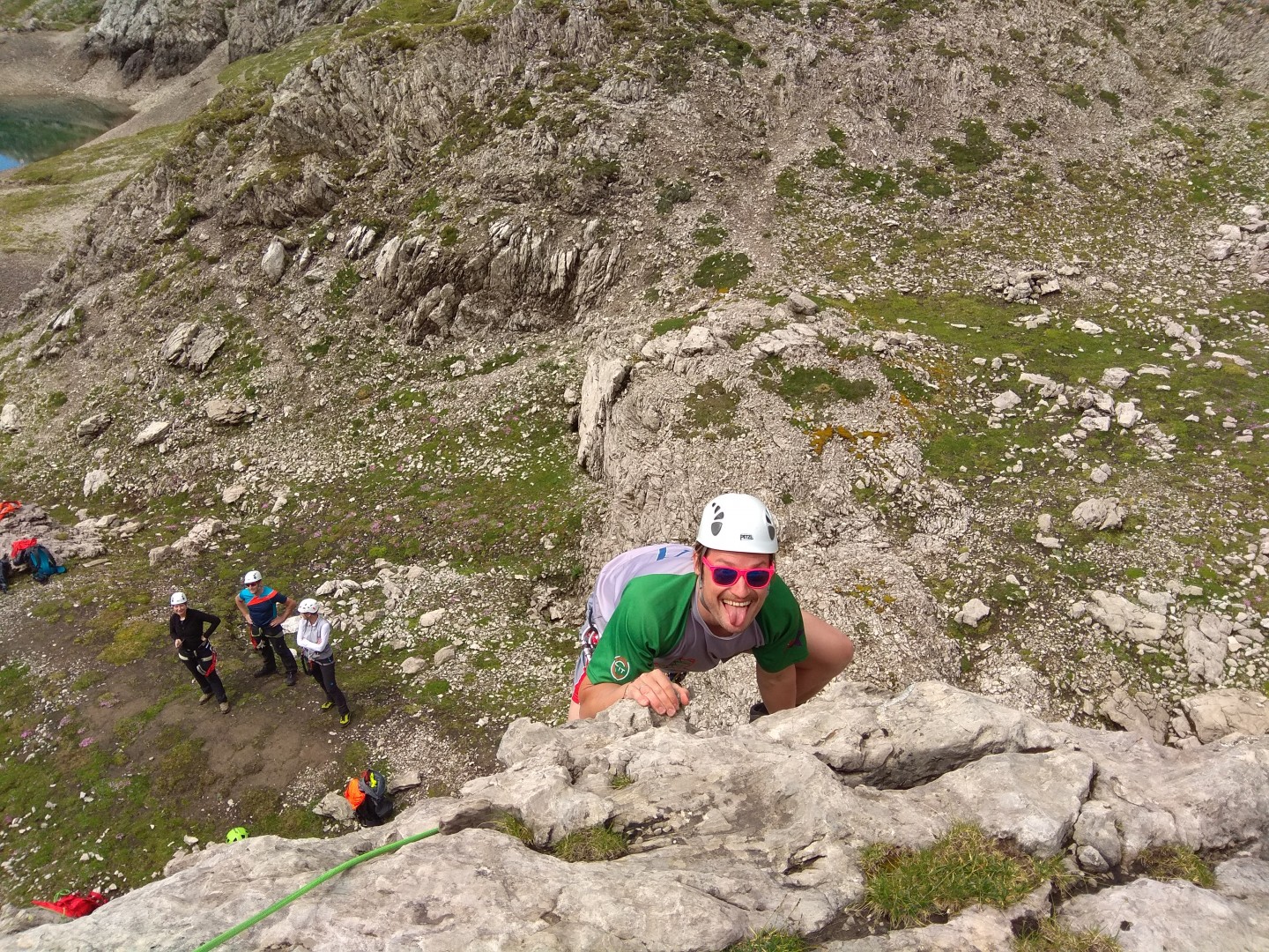 Ein kleines Wunder! Und die Chance das mitgeschleppte Klettersteigset doch noch auszuprobieren. Isi und Matthias gaben uns eine professionelle Einführung und schon stürzten wir uns in die erste Ferrata – eine Mordsgaudi! Die Freude war so groß, dass wir direkt die Chance zum Bad im nächsten Bergsee (unsere heimliche Passion) nutzten, bevor es weiterging mit Kraxel-Übungen. Wir probierten uns am Toprope-Klettern, stellten uns erstaunlich gut an – wenn man den erfahrenen Anfeuerern aka Bergführern glauben schenken möchte: „Super! Ja Wahnsinn! Die neuen Huaberbuam!“ Es bleibt der Verdacht, dass es trotz der Lobpreisungen noch ein weiter Weg bis zum El Capitan ist, den wir uns spontan als nächstes sportliches Ziel auserkoren haben…